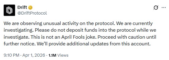 Drift опубликовала предупреждение в соцсети X и попросила пользователей не вносить средства до завершения расследования. Позже стало известно, что вывод средств тоже был отключен. Глава компании Helius Мерт Мумтаз отметил, что признаки взлома появились еще до официального подтверждения от Drift.